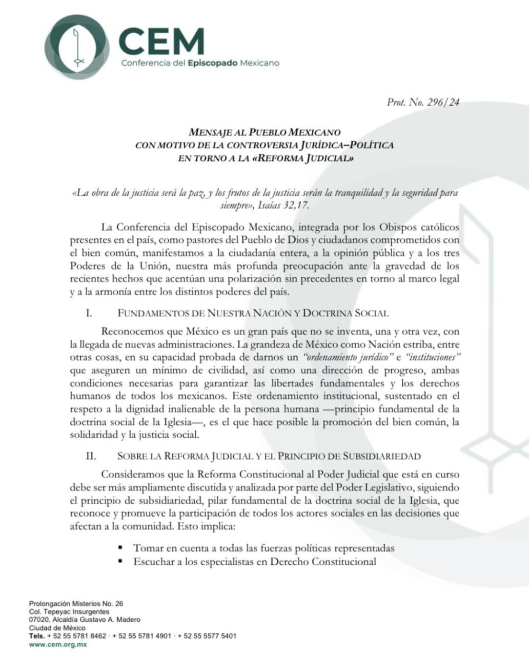 TAMBIÉN LA CONFERENCIA DEL EPISCOPADO MEXICANO, SE SUMA A LAS MUESTRAS DE PREOCUPACIÓN Y RECHAZO A LOS PROBLEMAS QUE VIVEN EN EL PODER JUDICIAL FEDERAL DE TODO EL PAÍS, DERIVADO TODO ESTO DE LA CAPRICHOSA Y VENGATIVA REFORMA QUE EN LA MATERIA, IMPULSO EL EX PRESIDENTE LÓPEZ OBRADOR…