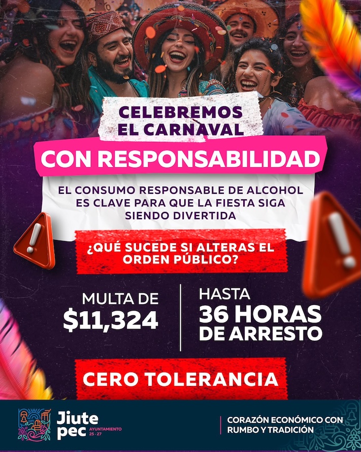 Más Noticias Felipe Villafaña enero 21, 2025 SOBRE ADVERTENCIA NO HAY ENGAÑO, EN EL CARNAVAL DE JIUTEPEC, QUIEN SE EXCEDA EN EL CONSUMO DE ALCOHOL Y ALTERE EL ORDEN, PAGA MULTA O ENCIERRO PREVENTIVO HASTA QUE SE LE BAJE EL CUETE…