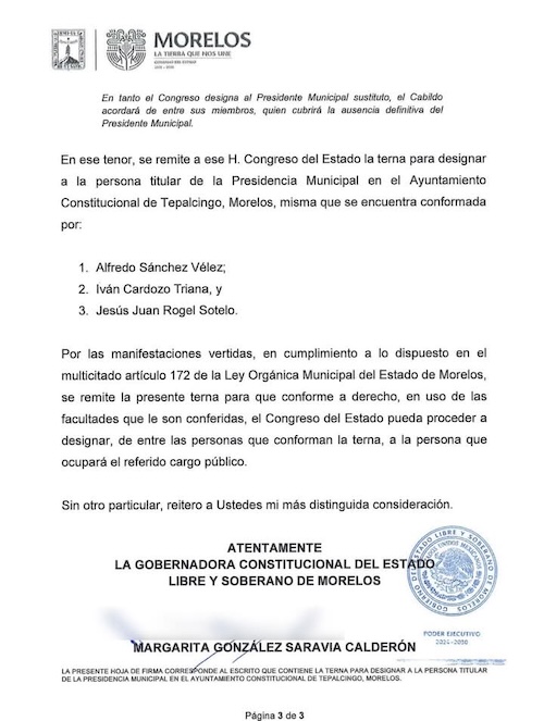 CUMPLE LA GOBERNADORA MARGARITA GONZÁLEZ SARAVIA SU PALABRA Y ENVIA AL CONGRESO DE MORELOS, LA TERNA DE DE LA CUAL SALDRÁ EL PRESIDENTE MUNICIPAL DE TEPALCINGO PARA LOS PRÓXIMOS TRES AÑOS: ALFREDO SÁNCHEZ VÉLEZ, IVÁN CARDOSO TRIANA Y JESÚS JUAN ROGEL SOTELO, SON LOS TRES ASPIRANTES A CONVERTIRSE EN NUEVOS RICOS DE AQUELLA COMUNIDAD…