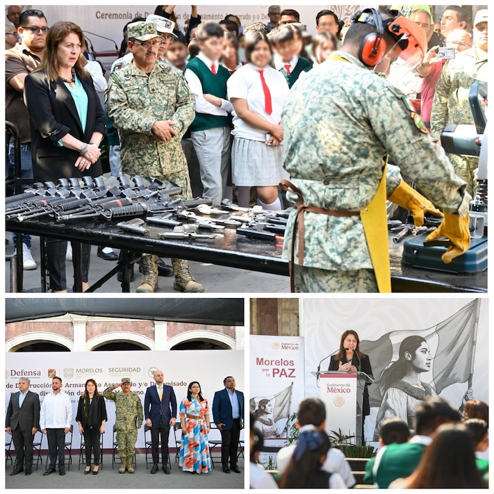En el acto, realizado en la Plaza de Armas “General Emiliano Zapata Salazar” de Cuernavaca, la primera mujer titular del Ejecutivo estatal, acompañada del edil capitalino, José Luis Urióstegui Salgado, destacó que “las armas se destruirán como un símbolo de que no queremos que las niñas, niños y jóvenes estén en medio de la violencia; queremos construir un Morelos de paz”.