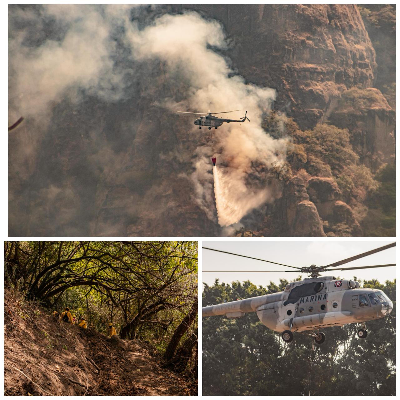En apoyo a las labores terrestres, se cuenta con la participación de dos helicópteros tipo MI-17 de la Semar y Defensa, que hasta el momento han realizado 19 descargas aéreas de 2,500 litros cada una.