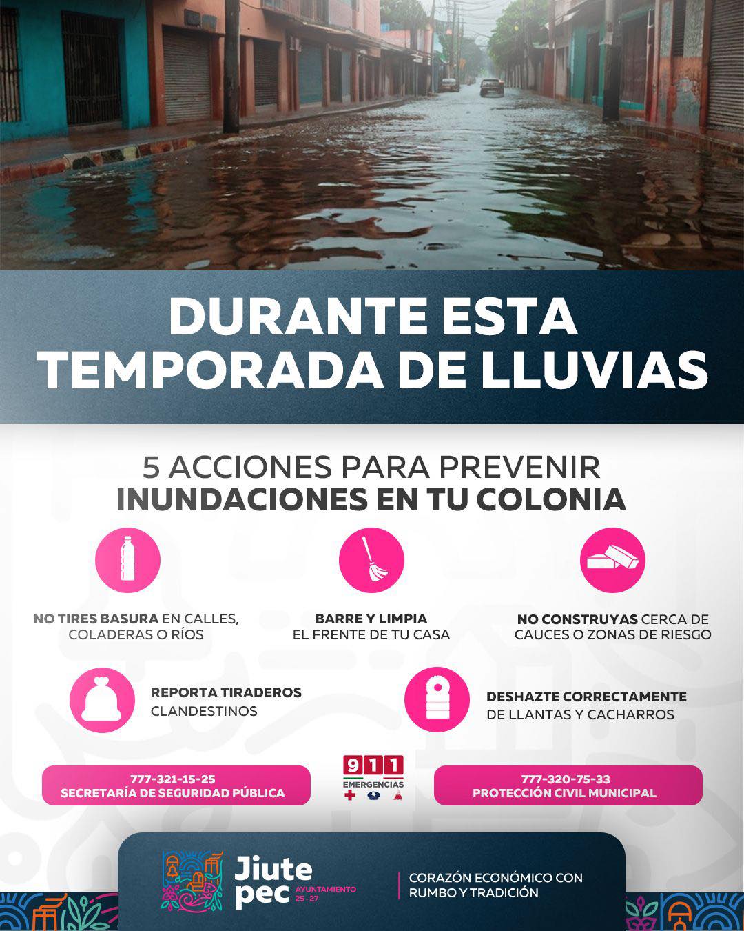 DURANTE ESTA TEMPORADA DE LLUVIAS, EL AYUNTAMIENTO DE JIUTEPEC INVITA A LA CIUDADANÍA A SEGUIR ESTAS 5 ACCIONES PARA EVITAR INUNDACIONES…