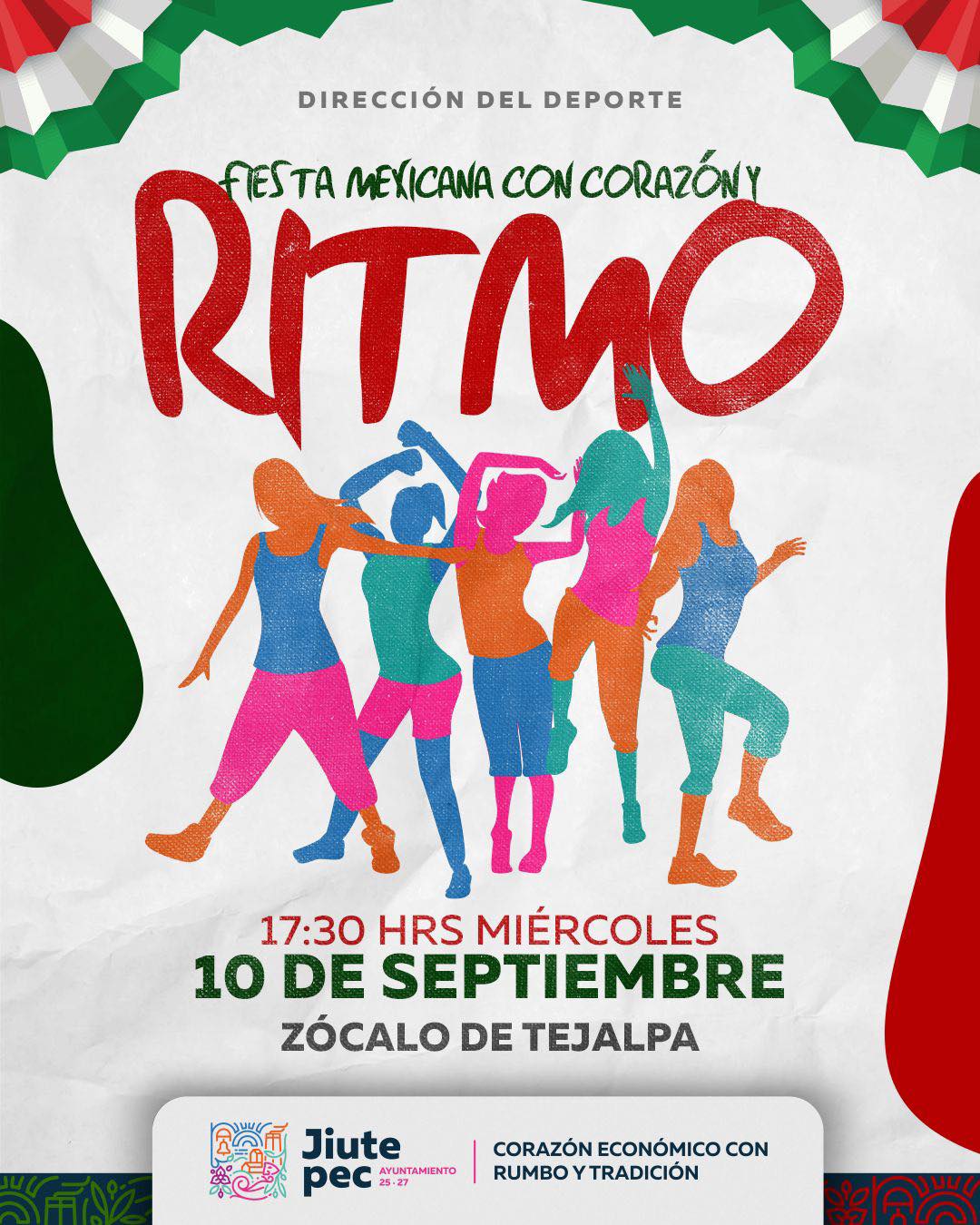 El Ayuntamiento de Jiutepec te invita a ser parte de la “Fiesta mexicana con Corazón y Ritmo”, una clase magistral especial de baile fitness y zumba.