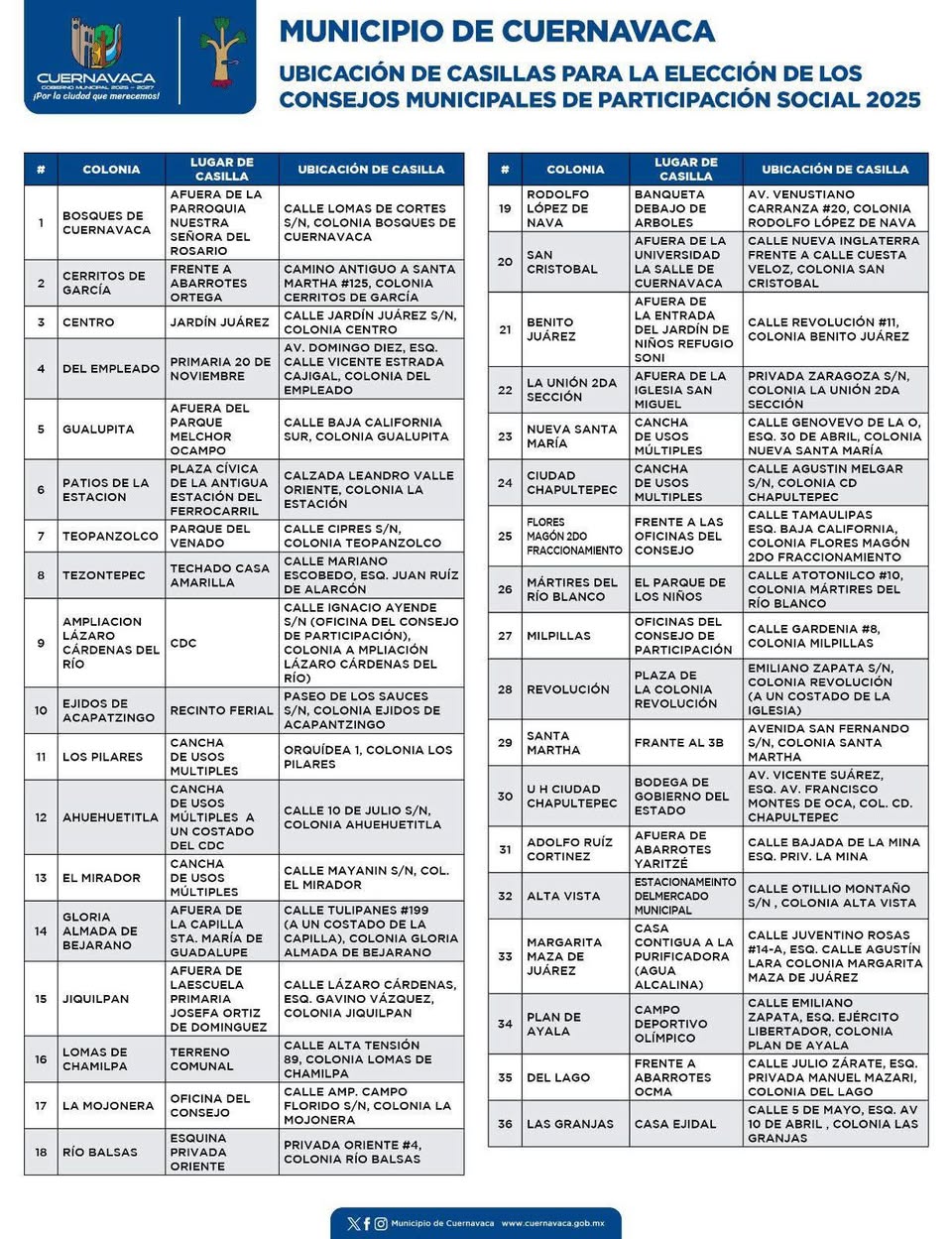 LISTA CUERNAVACA PARA LA ELECCIÓN DE CONSEJOS DE PARTICIPACIÓN SOCIAL ESTE DOMINGO…
