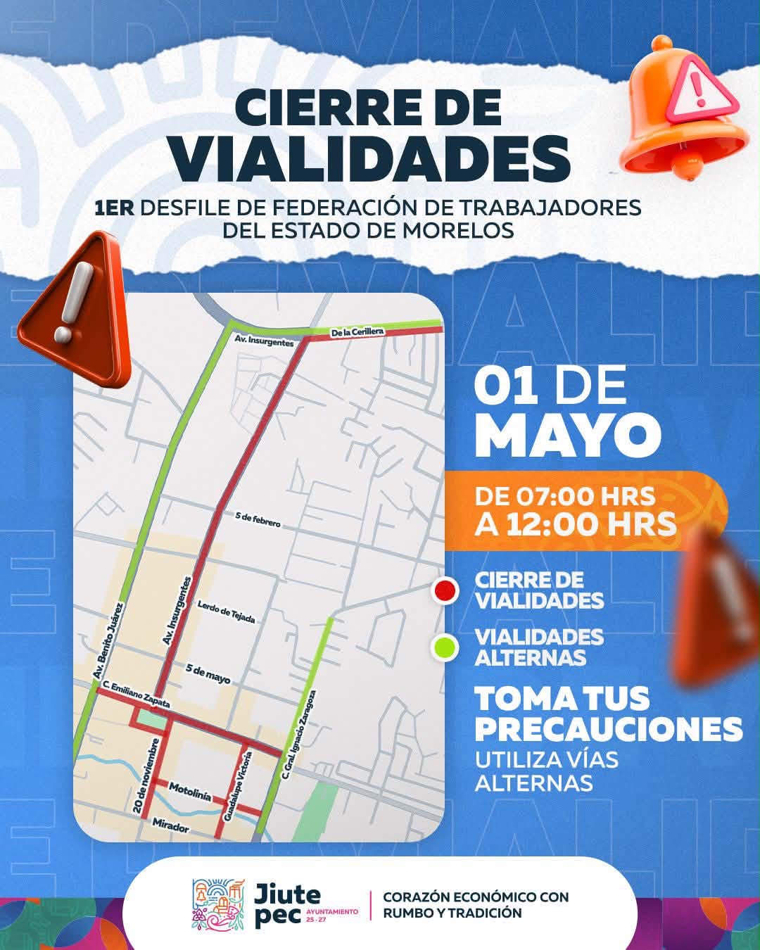 Se informa a la ciudadanía que este viernes 01 de mayo con motivo del 1er desfile de Federación de Trabajadores del Estado de Morelos, se realizarán cierres temporales de vialidades en calles del Centro del municipio.